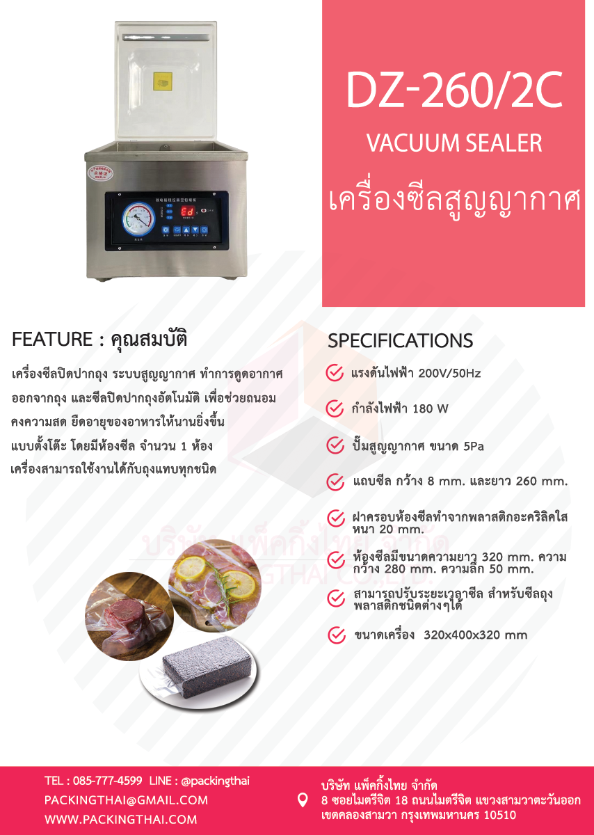 เครื่องซีลสูญญากาศ แบบตั้งโต๊ะ โครงสร้างทำด้วยแสตนเลส ทนทาน กันสนิม มีขนาดแท่งซีลยาว 260 mm. หรือ 26 cm. มีระบบการตั้งค่าแสดงด้วยระบบดิจิตอล ตั้งค่าการดูดอากาศ การซีล การทำให้เย็น โดยสามารถตั้งค่าได้หลากหลายให้เหมาะสมกับสินค้าและบรรจุภัณฑ์ เหมาะสำหรับการแพ็คข้าวสาร ลูกชิ้น ผัก ผลไม้ อาหาร เป็นต้น เพื่อถนอมอาหาร ยืดอายุอาหารให้เก็บไว้ได้นานมากขึ้น เครื่องสามารถใช้งานได้กับถุงแทบทุกชนิด เช่น ถุงสูญญากาศแบบเรียบ ถุงสูญญากาศลายนูน ถุงเย็น ถุง PE ถุงฟอบล์ และถุงสูญญากาศแบบจีบขยายข้าง สำหรับท่านที่ต้องการนำไปแพ็คข้าวสาร สามารถแพ็คข้าวสาร ให้เป็นรูปทรงแบบสี่เหลี่ยม แบบ 1 กิโลกรัม โดยใช้บล็อคช่วยนั้น เครื่องซีลสูญญากาศ รุ่น DZ-260/2C สามารถทำได้ครั้งละ 1 บล็อค หรือ 1 กิโลกรัม