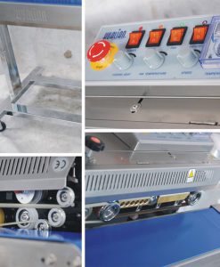 เครื่องซีลสายพานต่อเนื่อง แบบแนวนอน หรือเรียกได้อีกหลายอย่าง เช่น เครื่องซีลถุง เครื่องซีลปากถุง เครื่องปิดปากถุง เครื่องซีลถุงพลาสติก แต่จะแตกต่างกับเครื่องซีลถุง แบบมือกด หรือ แบบเท้าเหยียบ ตรงที่มีระบบสายพาน สำหรับจัดวางสินค้า เหมาะสำหรับงานที่ต้องการความรวดเร็วในการทำงาน รุ่นแนวตั้งเหมาะกับสินค้าที่มีลักษณะเป็นของเหลว หรือเป็นผงที่สามารถไหลออกจากปากถุงได้หากวางในแนวนอน แตกต่างจากรุ่น FRB-770 ตรงที่มีชุดพิมพ์วันที่มากับเครื่องเลย โดยจะทำการพิมพ์วันที่ลงบนรอยซีล สามารถกำหนดเป็นวันผลิต วันหมดอายุ การใช้งานง่าย ไม่ยุ่งยากซับซ้อน มีฟังก์ชันหยุดการทำงานฉุกเฉิน เพิ่มความสะดวกในการทำงาน สามารถเปิดใช้งานติดต่อกันได้นานทั้งวัน โดยไม่เปลืองไฟ สินค้ารับประกัน 1 ปี ยกเว้นอะไหล่สิ้นเปลือง เช่น สายพานตีนตะขาบ,สายพานเทปลอน ฯ